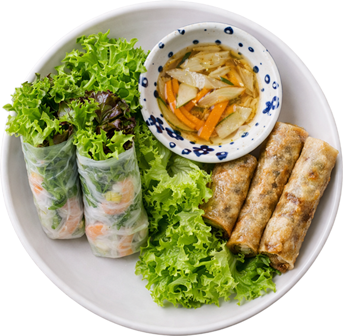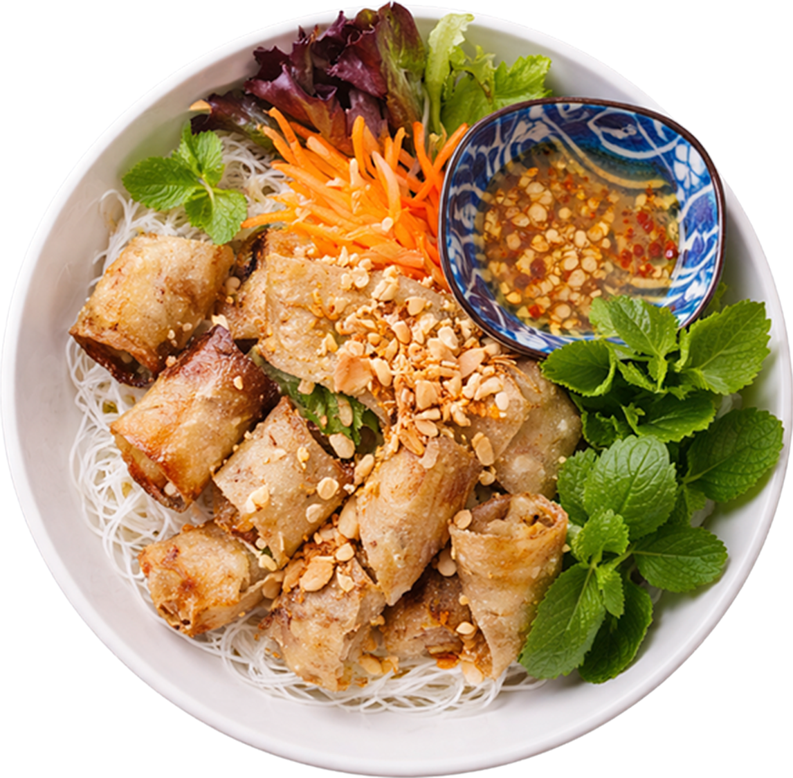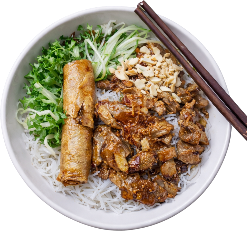 Hanoi-style; traditional crispy spring rolls, served with vermicelli, tooped with crushed peanuts and fresh herbs.