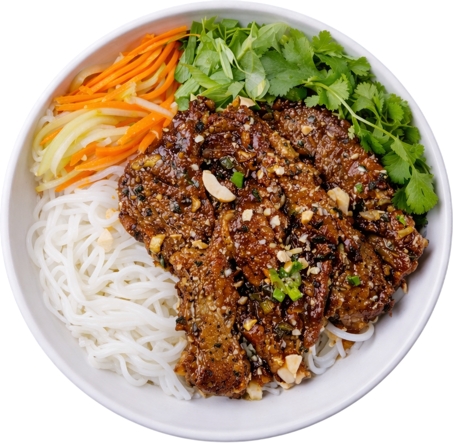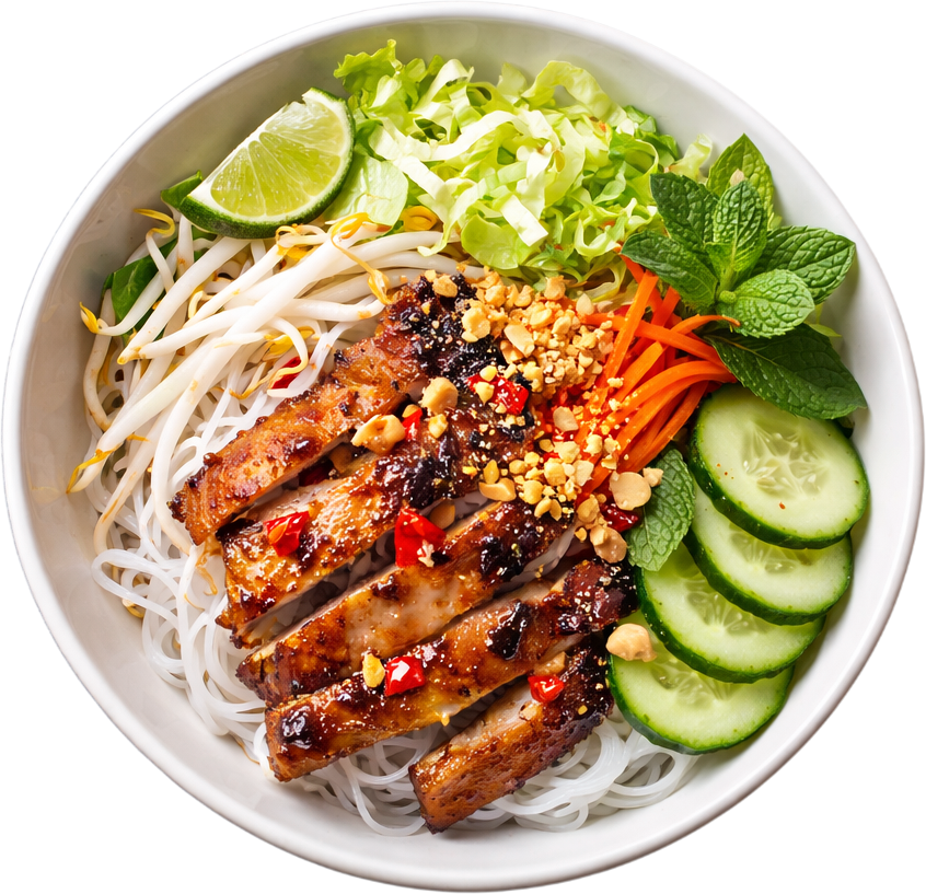 Signature marinated pork grilled and served with vermicelli, topped with crushed peanuts and fresh herbs