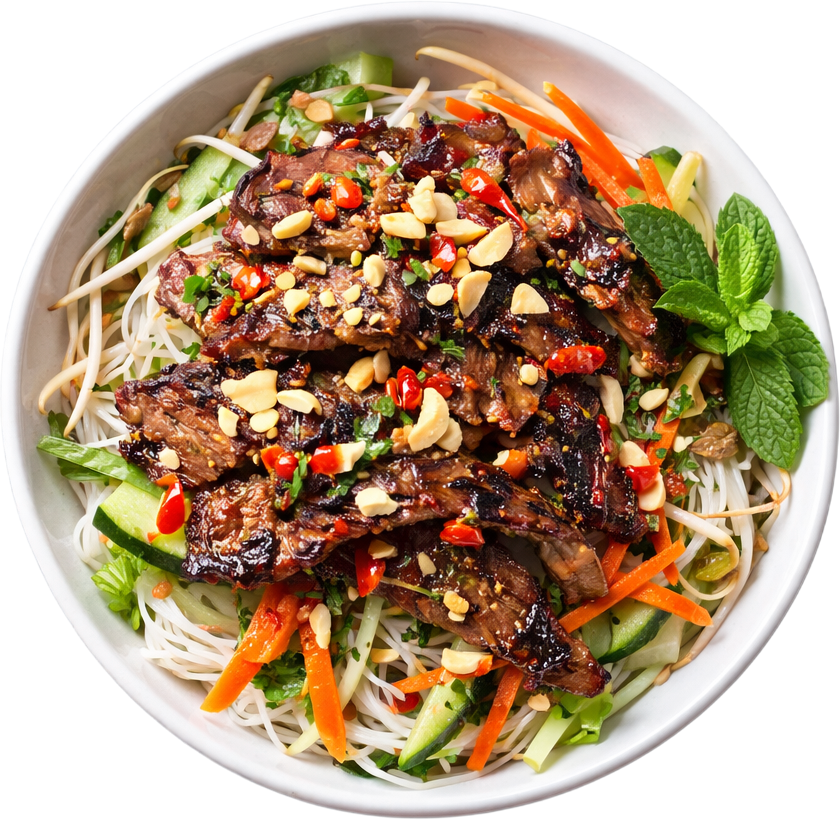 Signature marinated grilled chicken served with vermicelli, topped with crushed peanuts and fresh herbs