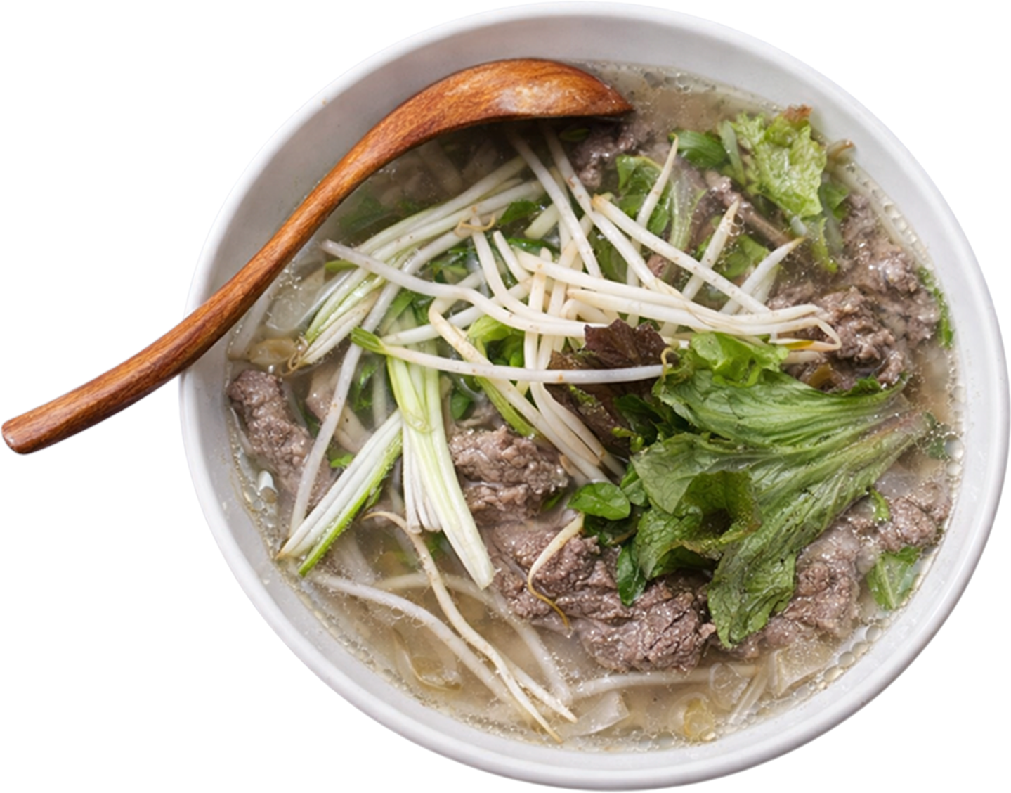 Traditional beef pho with thinly sliced slow cooked beef in an aromatic broth.