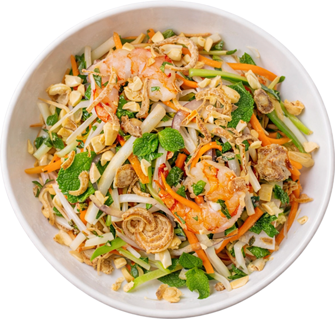 Refreshing lotus stem, fresh herbs, choices of protein served with crushed peanuts.