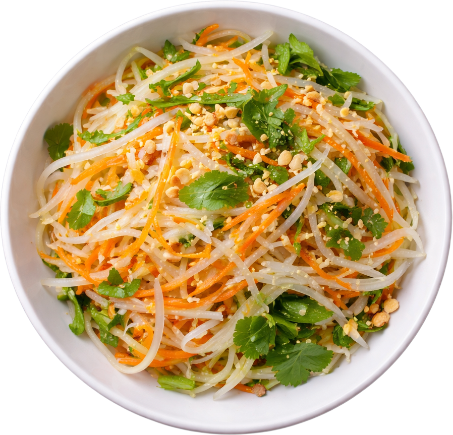 Lemongrass stir-fry with vermicelli or flat rice noodle with choices of proteins, topped with crushed peanuts and fresh herbs: