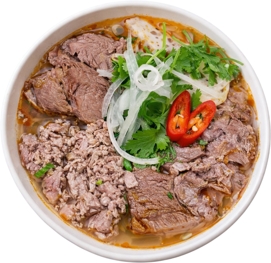 Bun Hue is a spicy noodle with rich and slightly salty, hints of shrimp and lemongrass broth served with